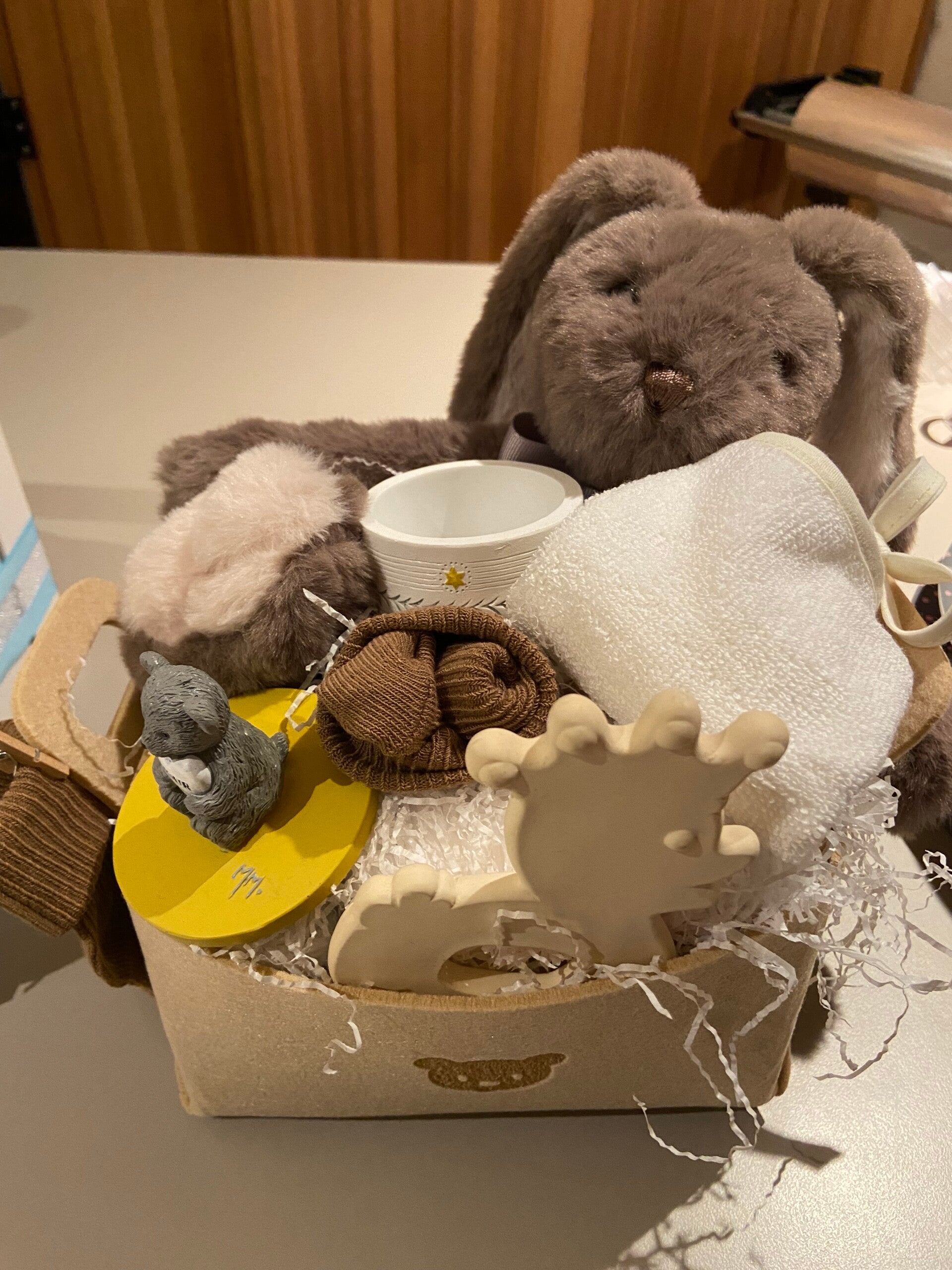 - Een prachtig vilten mandje, ideaal om later nog babyspulletjes netjes in te bewaren. Een stijlvolle en praktische toevoeging die ook na het uitpakken een mooie plaats krijgt.